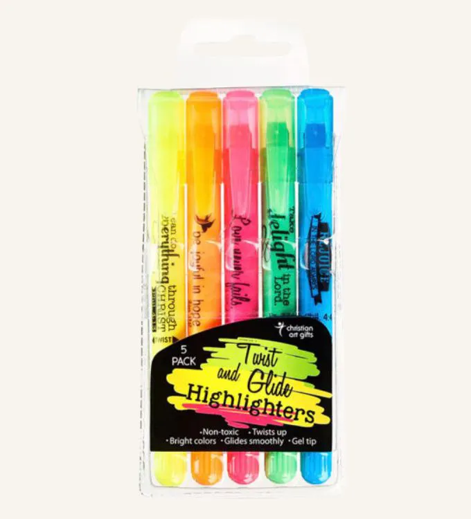 Pakke med fem gelbaserte markeringspenner som egner seg godt for å markere i Bibelen. Sverter ikke gjennom sidene i Bibelen ved bruk.