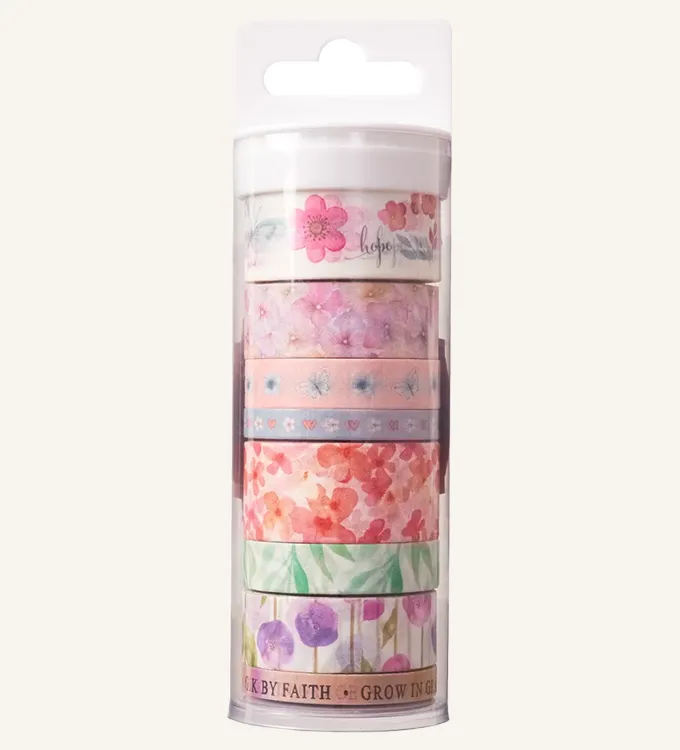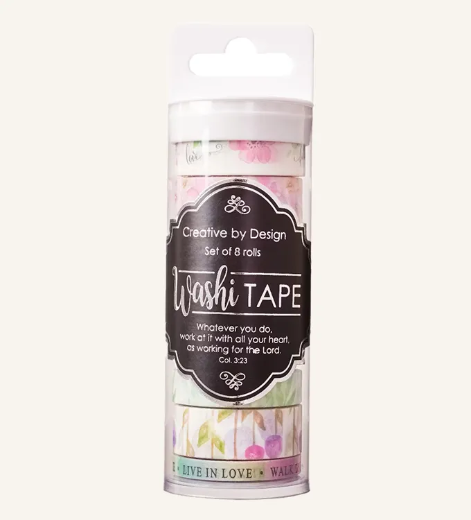 De 8 rullene med washi tape gir uendelig med muligheter. Enten det er å bruke de på glasskrukker, mobildeksler, notatbøker, bibel – eller nesten hva som helst du ønsker å dekorere.